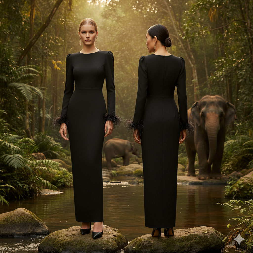 This exquisite long black stretch gown combines timeless elegance with contemporary glamour. The fitted silhouette showcases a sleek, modern aesthetic, while ornate feather embellishments add texture and visual interest. Engineered from responsive stretch fabric, it provides a second-skin fit that moves naturally with your body, ensuring you feel as confident as you look. Ideal for formal galas, upscale dinners, and milestone celebrations, this gown delivers the refined sophistication that discerning guests expect. A versatile wardrobe essential that transcends occasion and season.